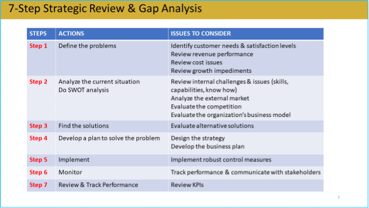 We adopt a 7-Step approach in carrying out a strategic review as well gap analysis for organizations before the commencement of any training programs.