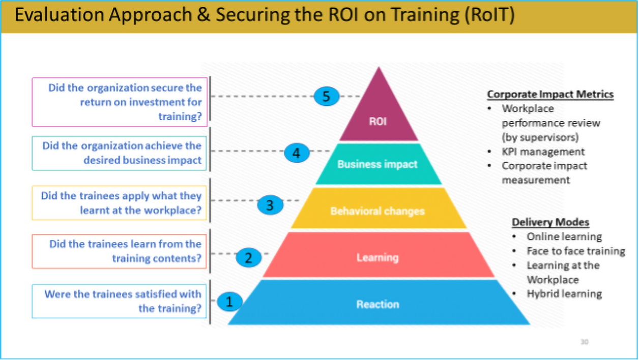 For evaluation of training effectiveness, we focus primarily on organizational or business impact as well securing the returns on investment in training and development as shown in the chart below:
